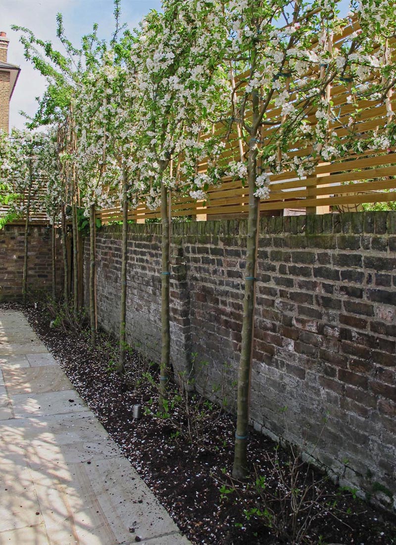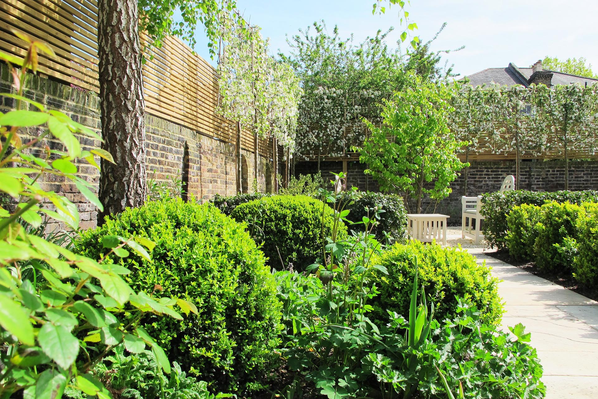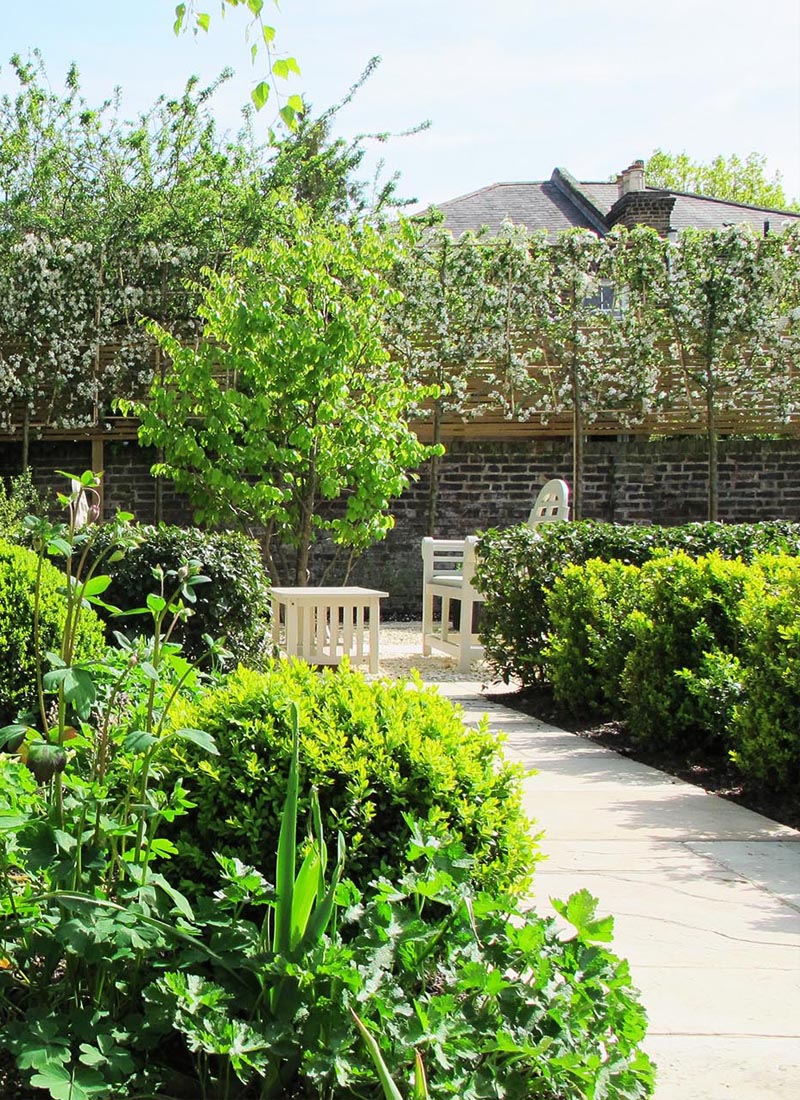 For the client, a keen and proficient plantsman, soft landscaping was particularly important. The planting scheme was developed to provide year round interest with evergreen structure and perennial bursts of colour and scent. A backbone of flowering shrubs such as Vibernum tinus and Buxus sempervirens combined with wonderful structural plants full of interesting form, texture and shape, like Panicum virgatum ‘Heavy Metal’ and Parottia persicaria were carefully woven together with a palette of flowering climbers, perennials, annuals and pleached trees to ensure year round interest and wonderful seasonal displays.