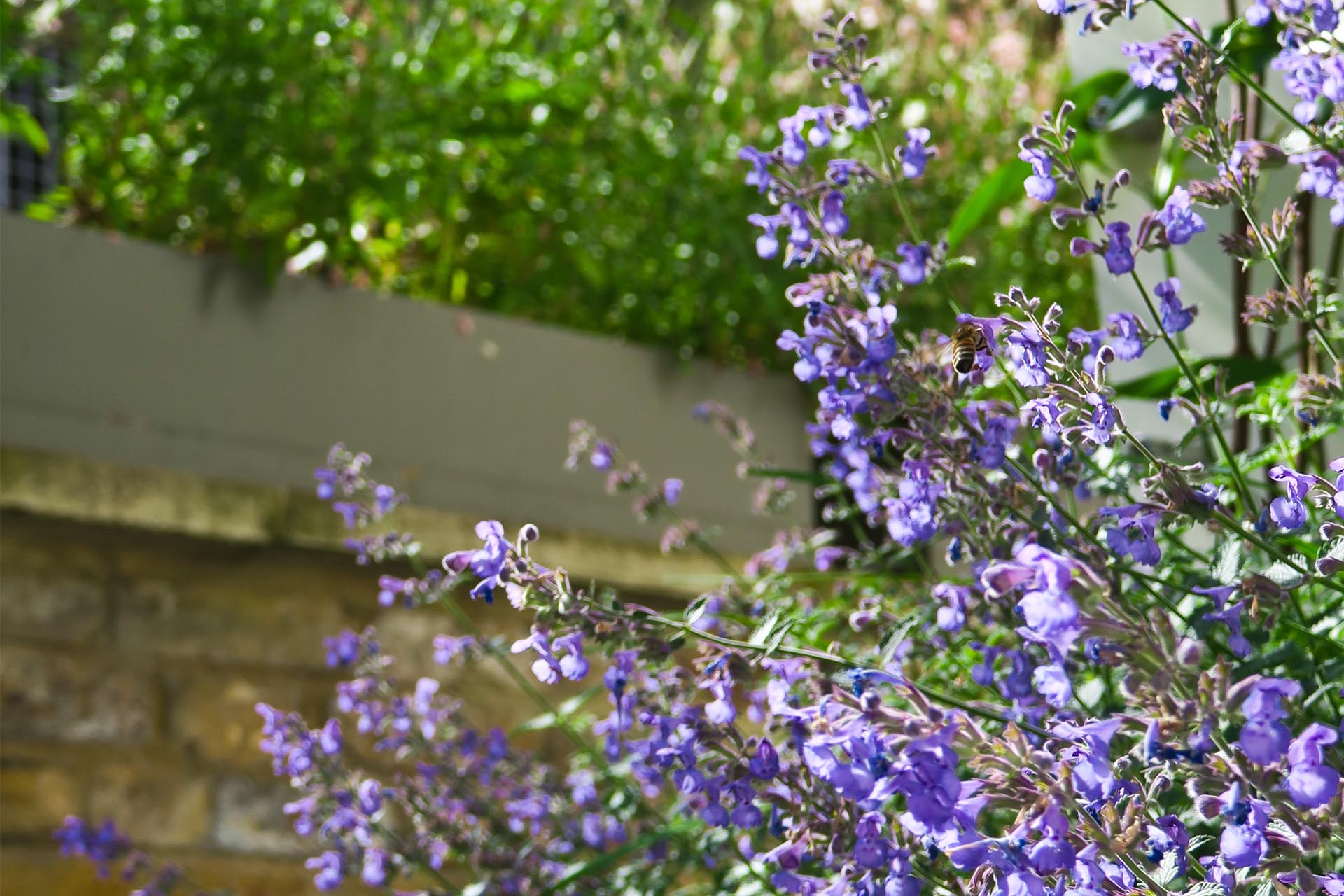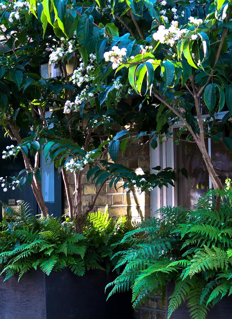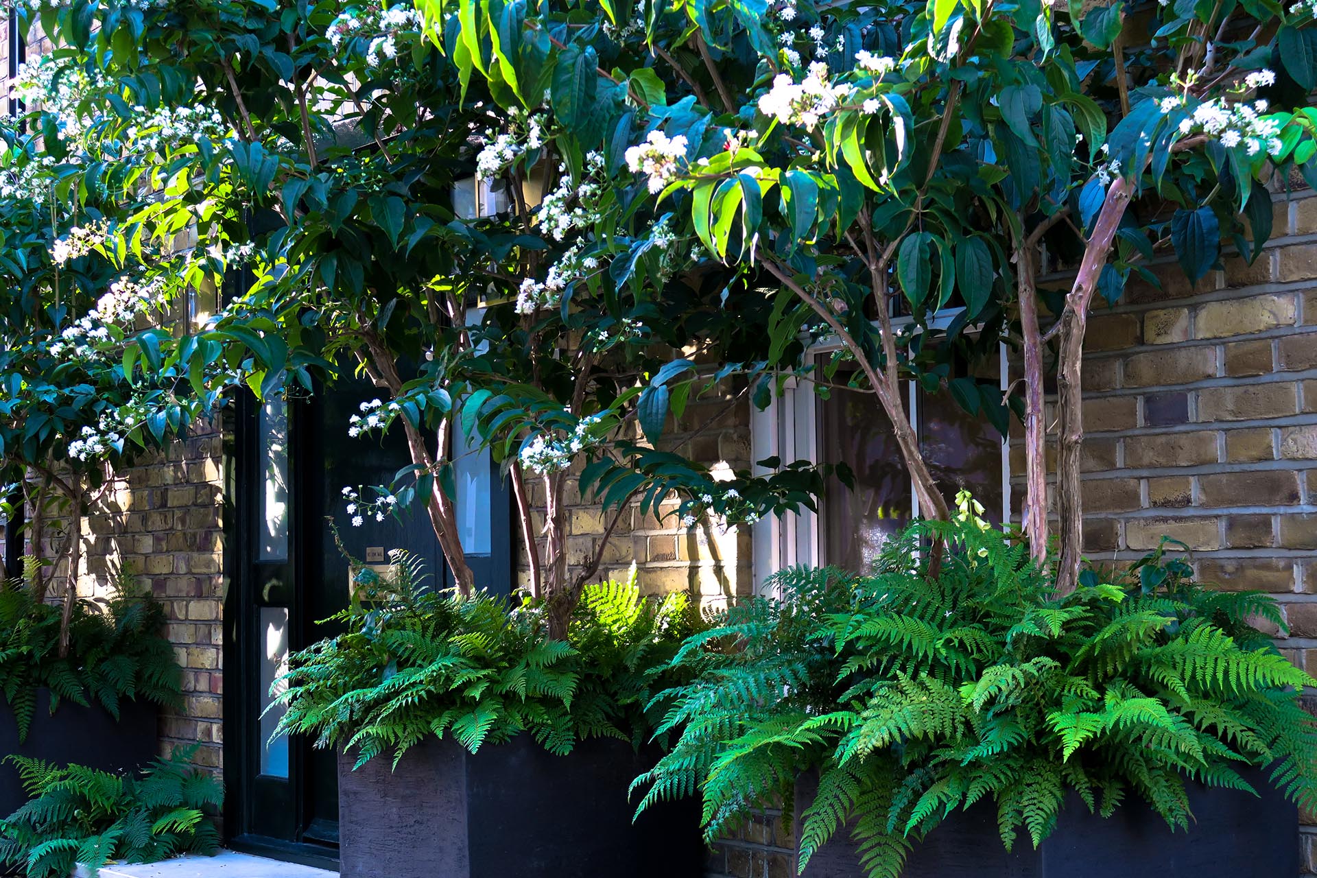 It was important to impart year round impact to the entrance so we introduced large, bespoke statement planters, specimen trees and contemporary brass wall lights. The silhouettes of the multi-stemmed trees combined with evergreen underplanting ensured an elegant and dynamic effect through the winter months. The spring flowering perennials and autumn flowering Heptacodium were covered in bees in their first year - testimony that the neighbourhood pollinators had a new source of early and late forage as intended!