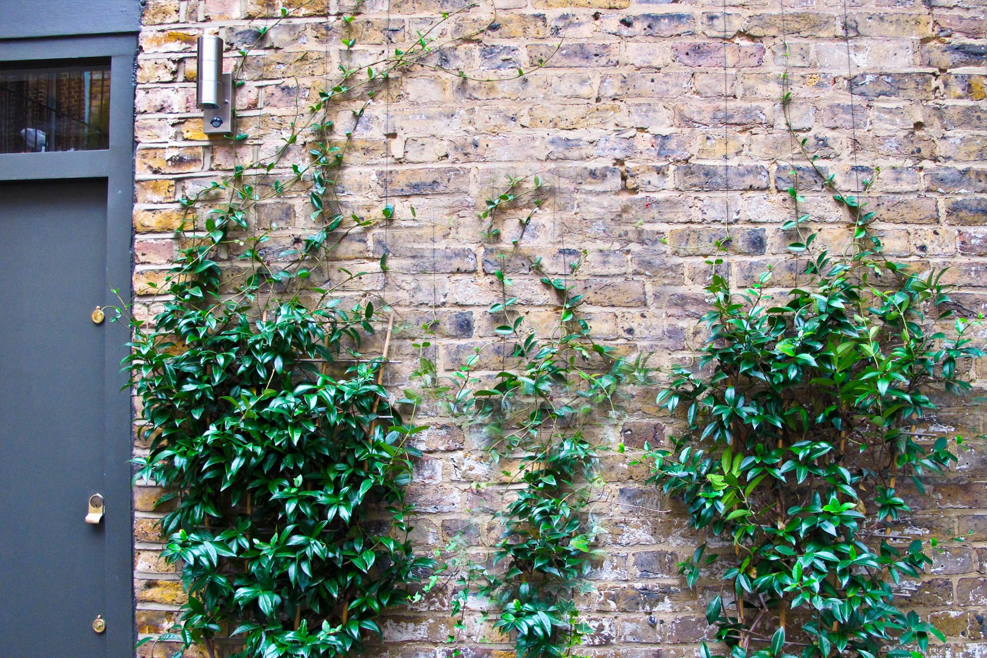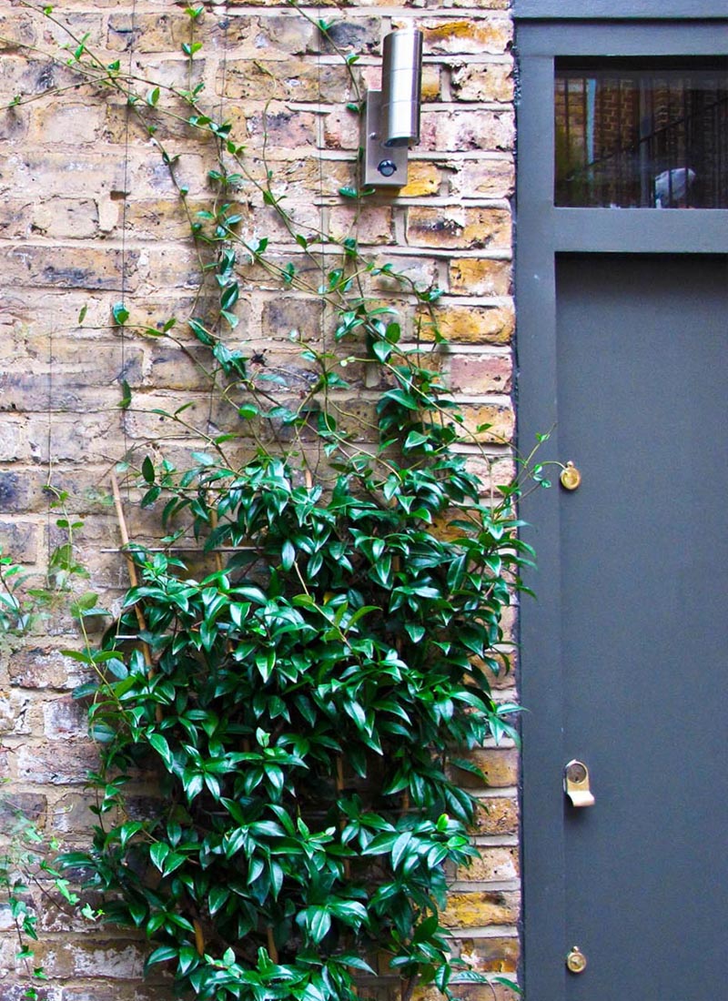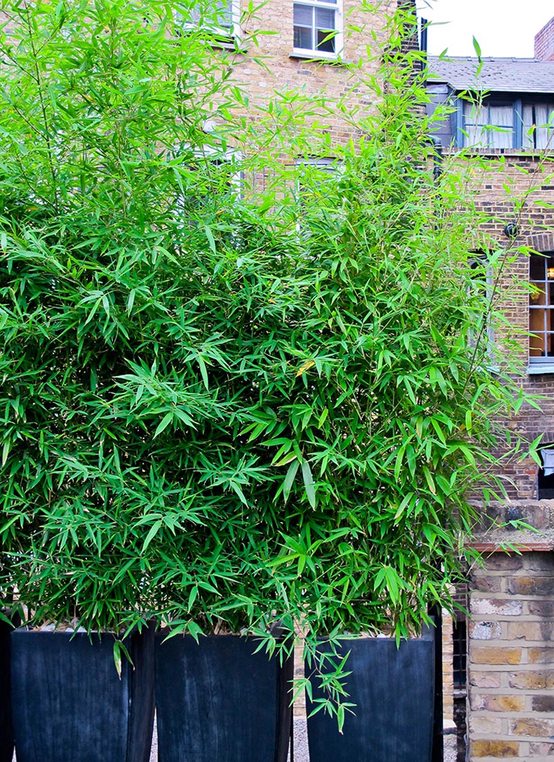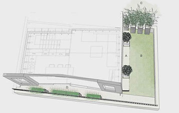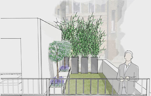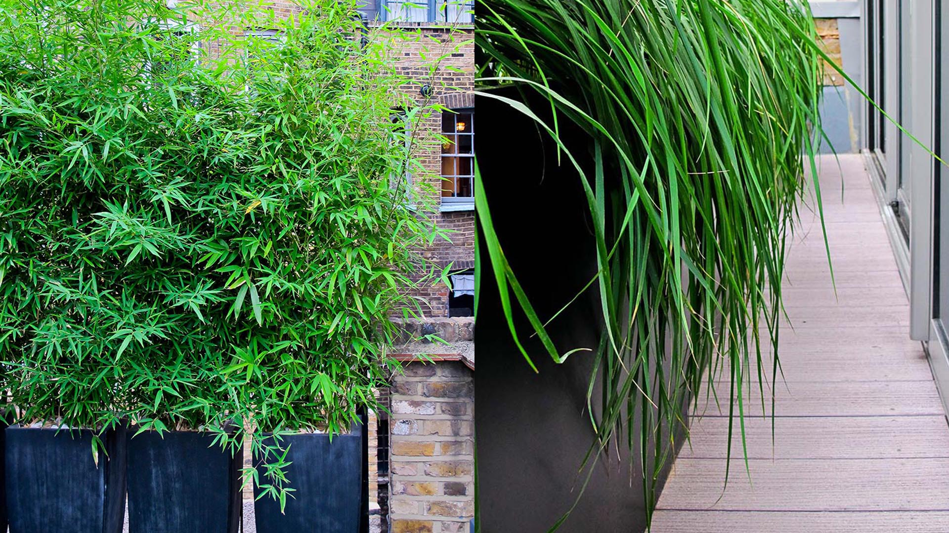 On the upstairs balcony and terrace a fresh, contemporary design was developed. Slim powder coated planters filled with ornamental grasses and a sprinkling of perennial colour soften the view from the kitchen/living room. A light composite decking requiring very little maintenance and huge durability was introduced for the narrow stretch of balcony and a section of low maintenance turf installed on the side terrace. Here, a natural and striking screen of Bamboo was established to provide privacy from the flats behind and bespoke seating crafted to make the most of the afternoon sun.