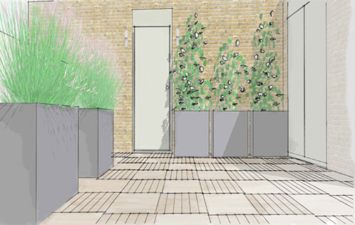 The design for the entrance had to incorporate the existing decking material that was re-worked to become a subtle but attractive feature while the hard landscaping was softened with low maintenance planting.