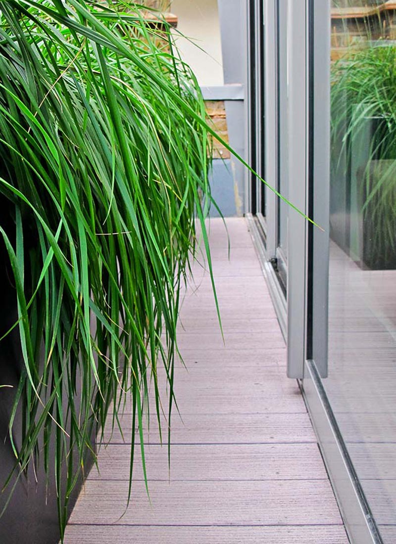 On the upstairs balcony and terrace a fresh, contemporary design was developed. Slim powder coated planters filled with ornamental grasses and a sprinkling of perennial colour soften the view from the kitchen/living room. A light composite decking requiring very little maintenance and huge durability was introduced for the narrow stretch of balcony and a section of low maintenance turf installed on the side terrace. Here, a natural and striking screen of Bamboo was established to provide privacy from the flats behind and bespoke seating crafted to make the most of the afternoon sun.